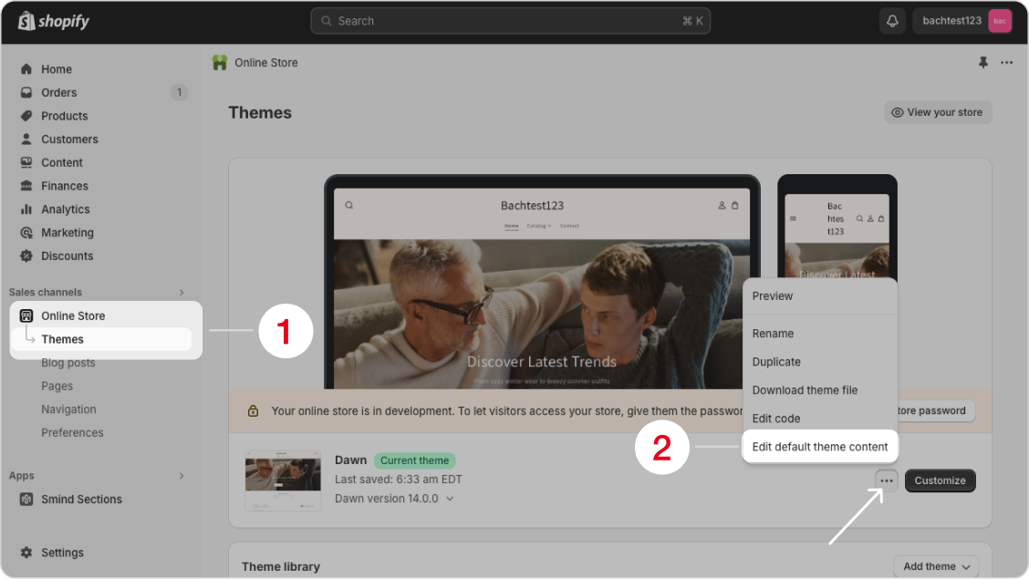 2. Choose the theme that Smind is working on, click "More actions", then choose "**Edit default theme content**".