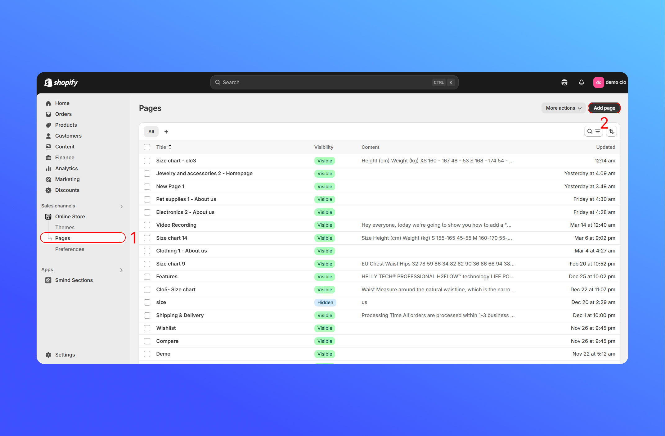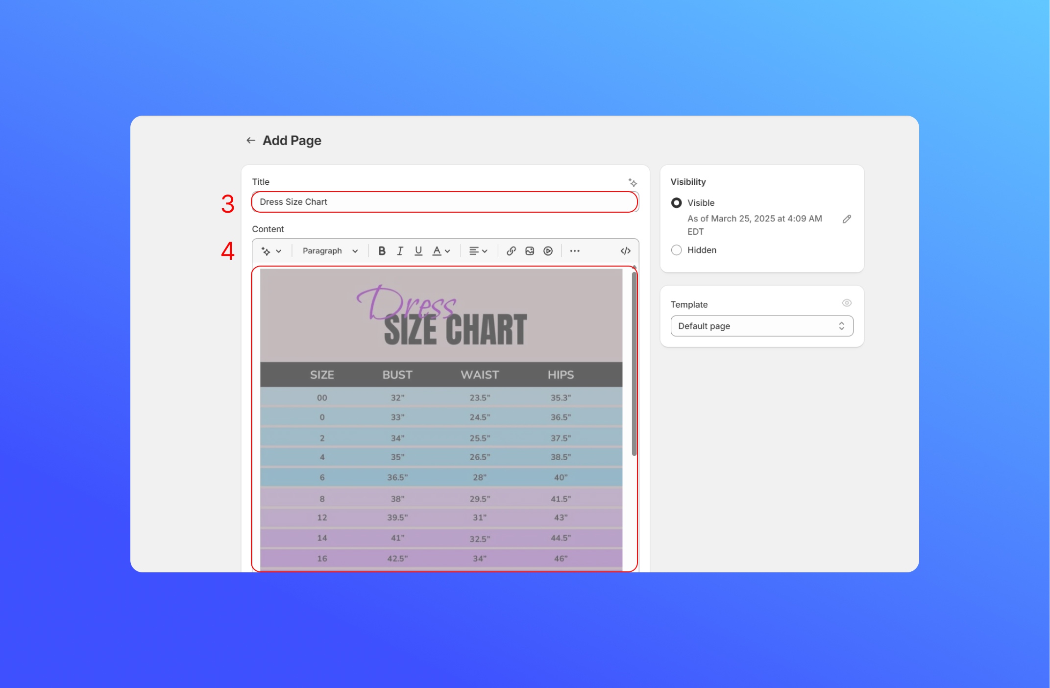 4. Enter the content for the page, you can upload your own size chart image or table (like JPG or PNG file). Click **Save**
