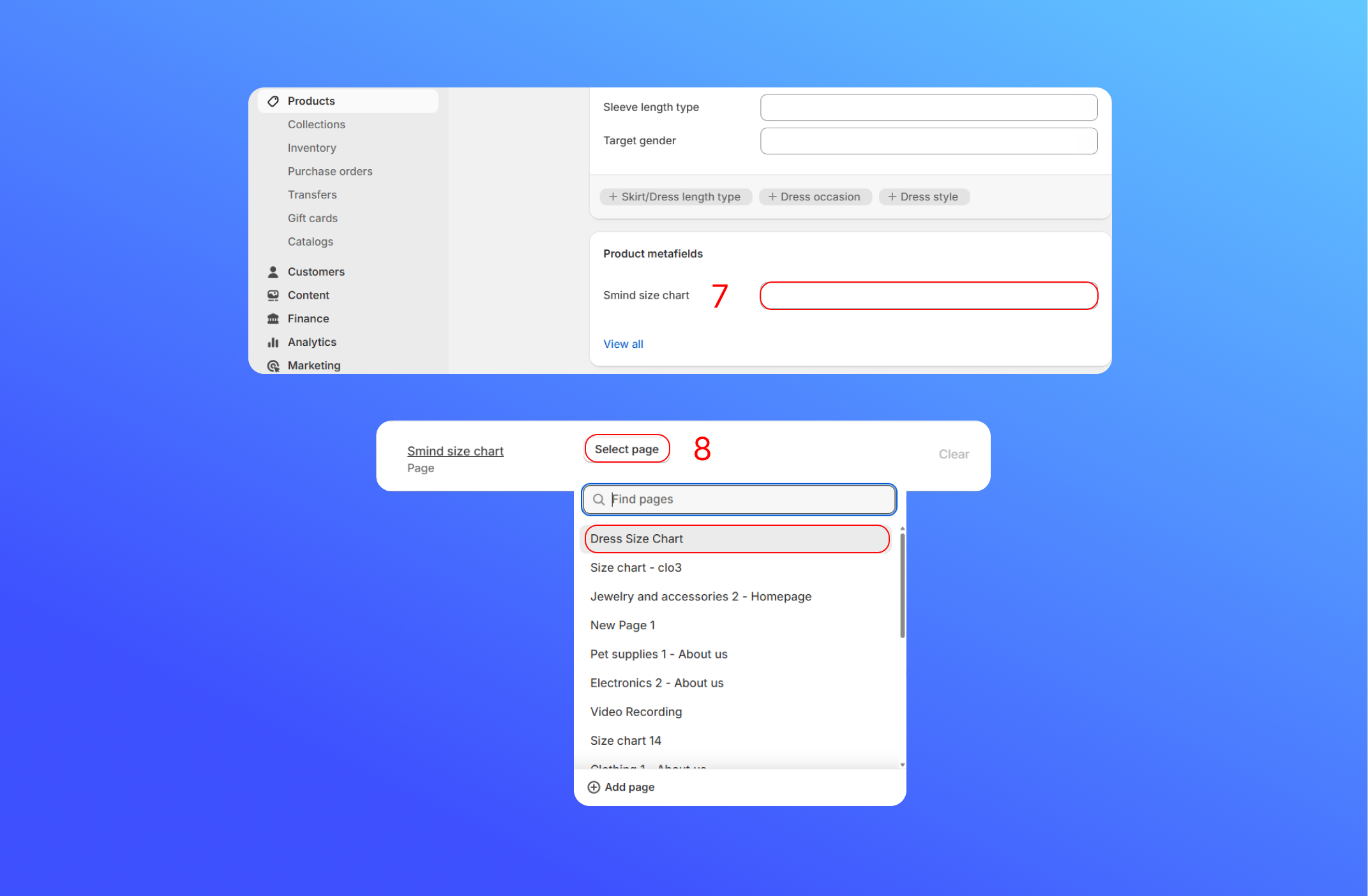 8. Click **Select Page**, and choose the size chart page. For example: Dress Size Chart. Click **Save**
