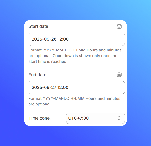 * **Start date**: This optional field determines when the countdown timer becomes visible. If a start date is set, the timer will only appear on your site once that date and time have been reached. The format is YYYY-MM-DD HH:MM. (For example: 2025-09-26 12:00)