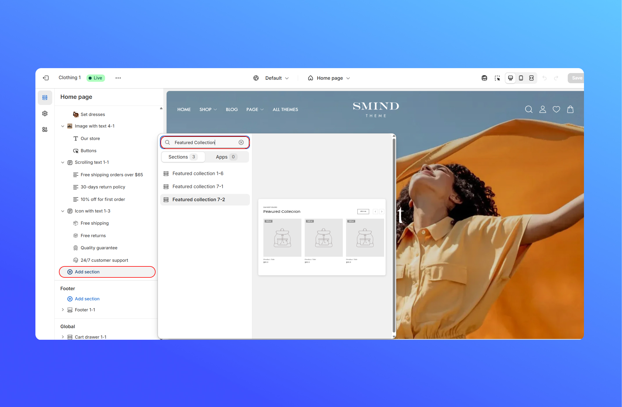 After installing a section from the Smind Library, you still need to add it manually to your **current theme’s template.**