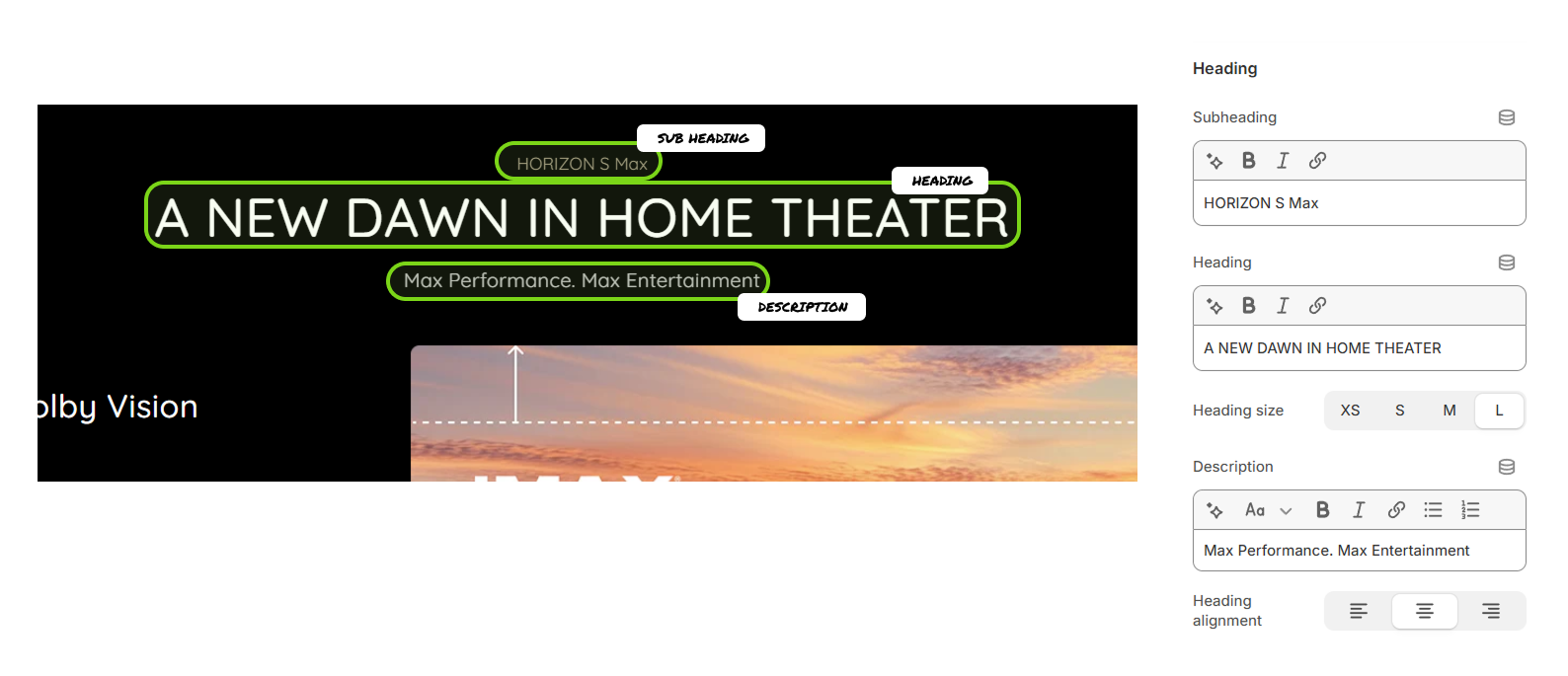 * **Heading alignment**: Sets the horizontal alignment for all the text in the Heading block