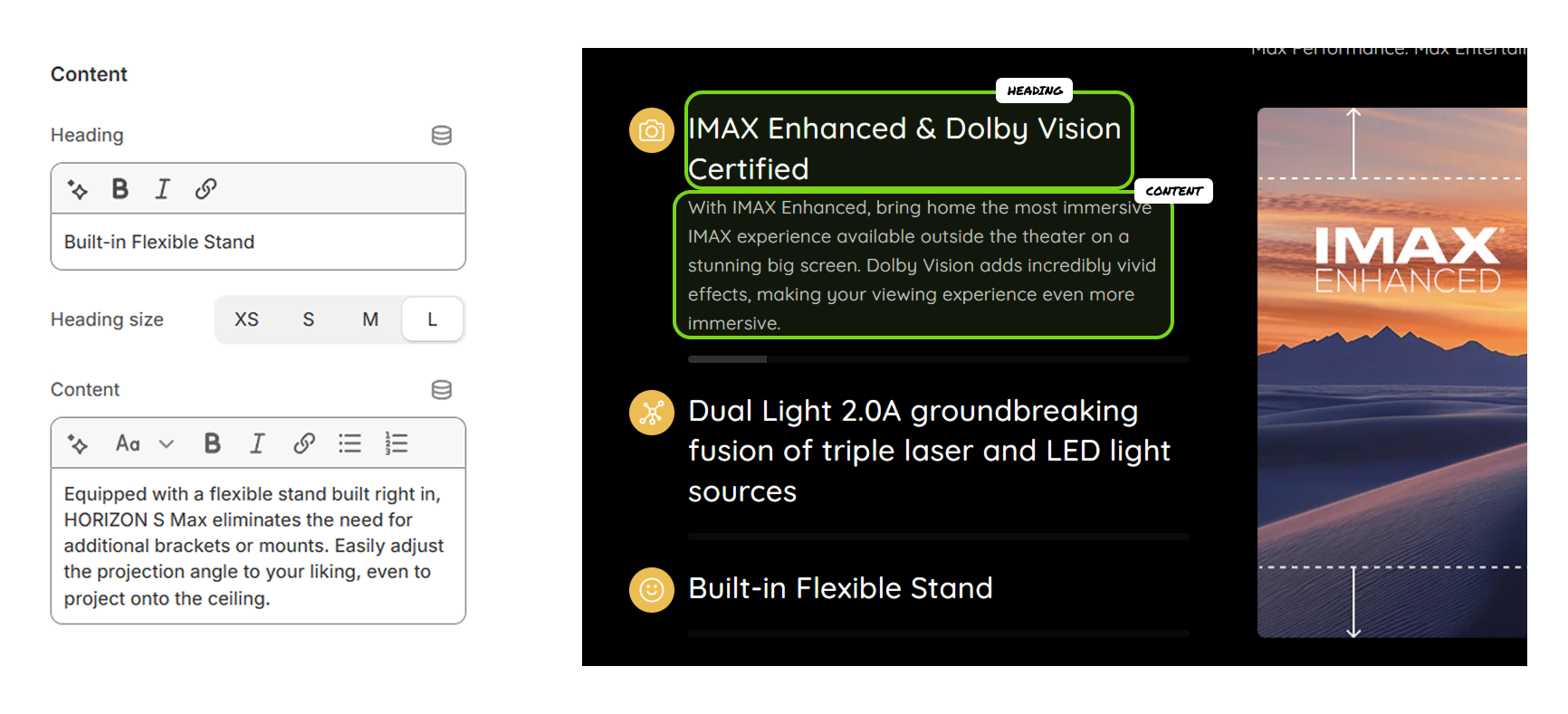 That's why we created a new section we call **Image With Text #8**. It’s interactive. When a customer clicks on a headline for a feature, the picture right next to it changes to match. It’s all laid out neatly, with the image and text sitting side-by-side.