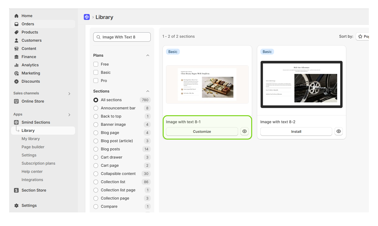 Step 1: In Shopify Admin, going to Smind Section app and find **Image With Text 8** in Section tab of Library. Click Install and Customize it.