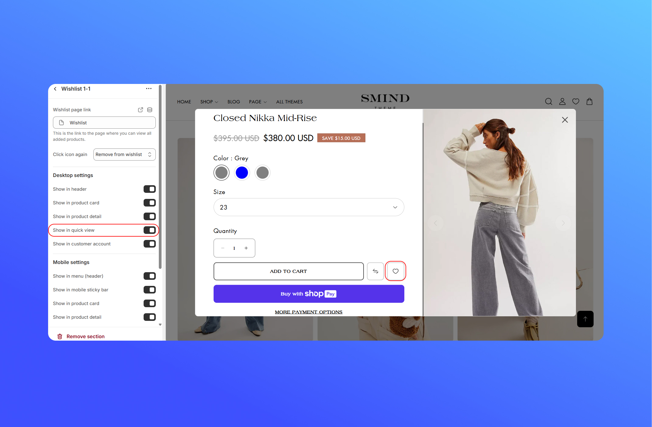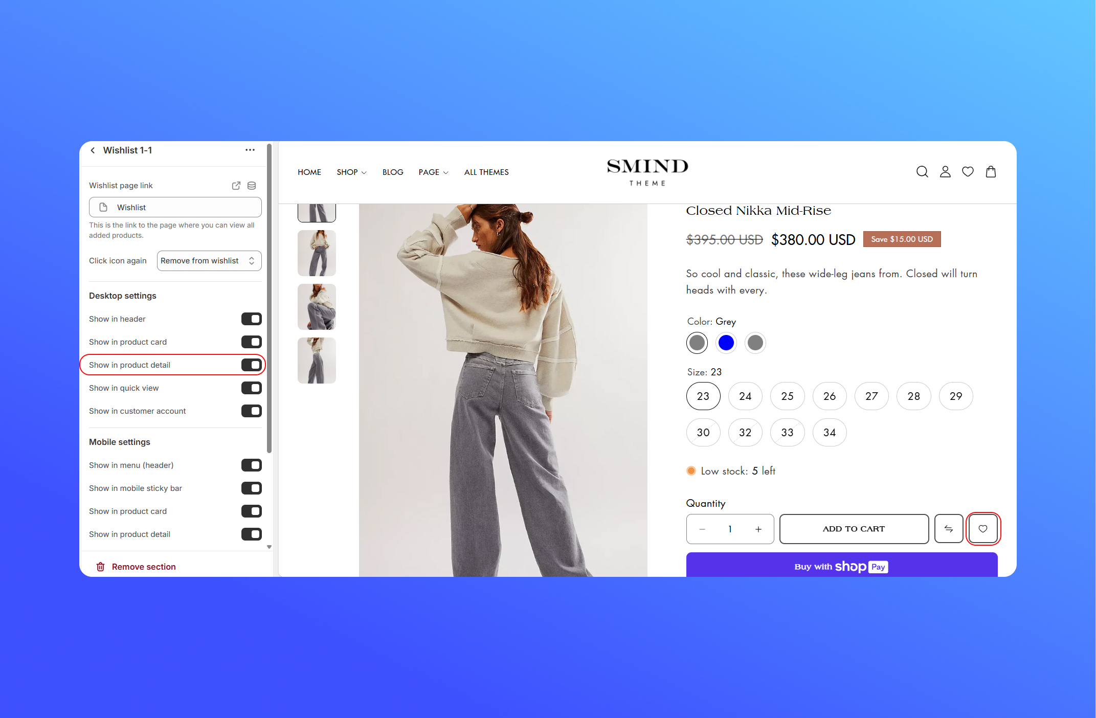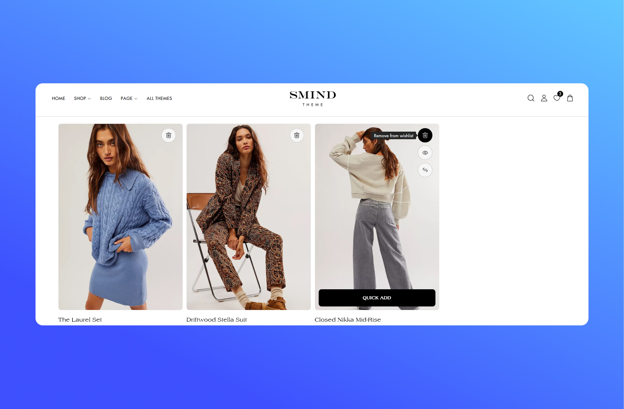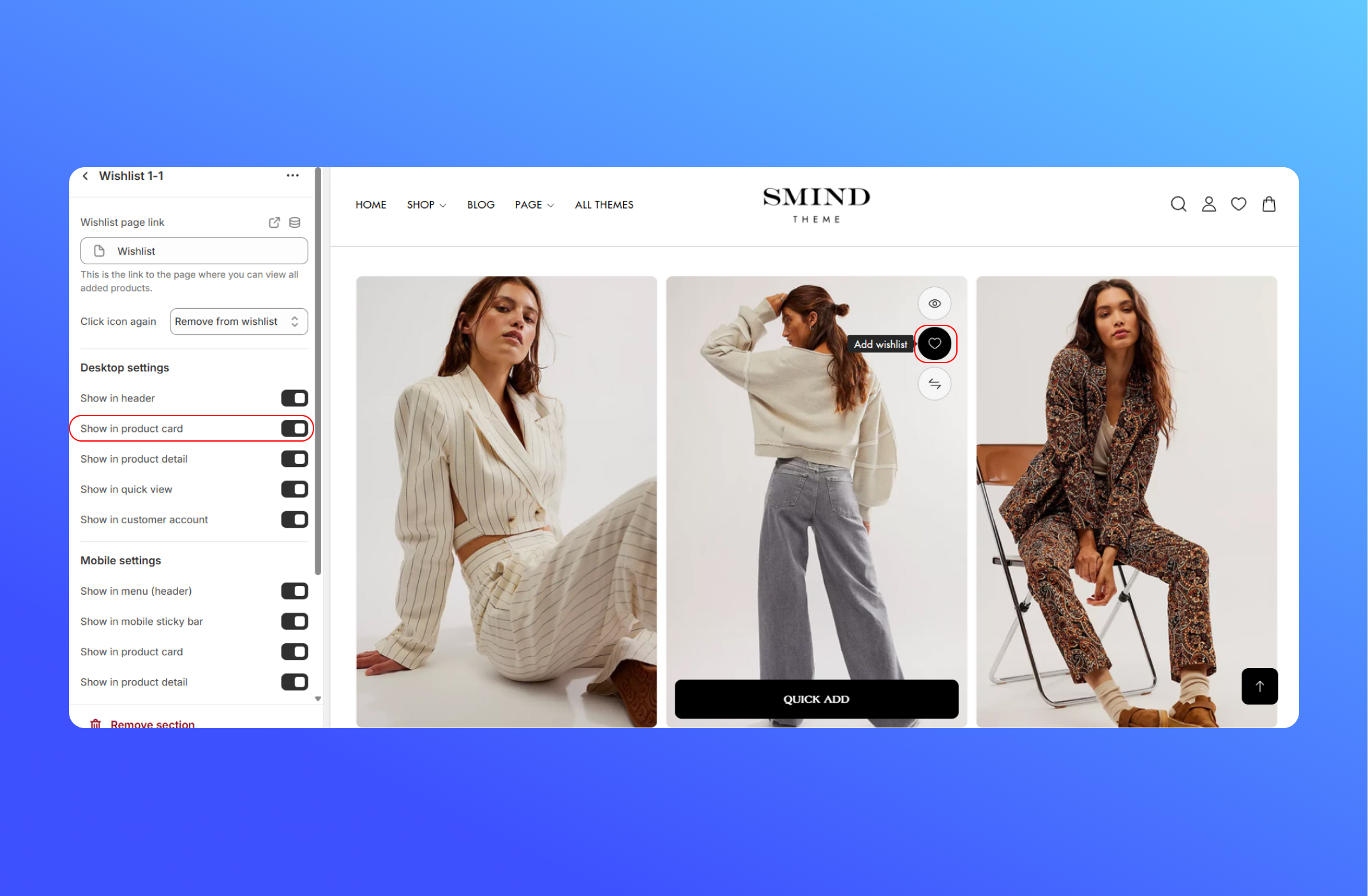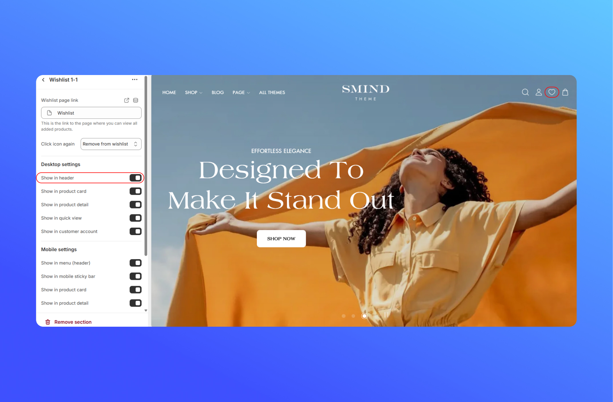 * The **"Wishlist"** section in "Smind sections" app allows customers to save products they’re interested in **"Wishlist page"**.
