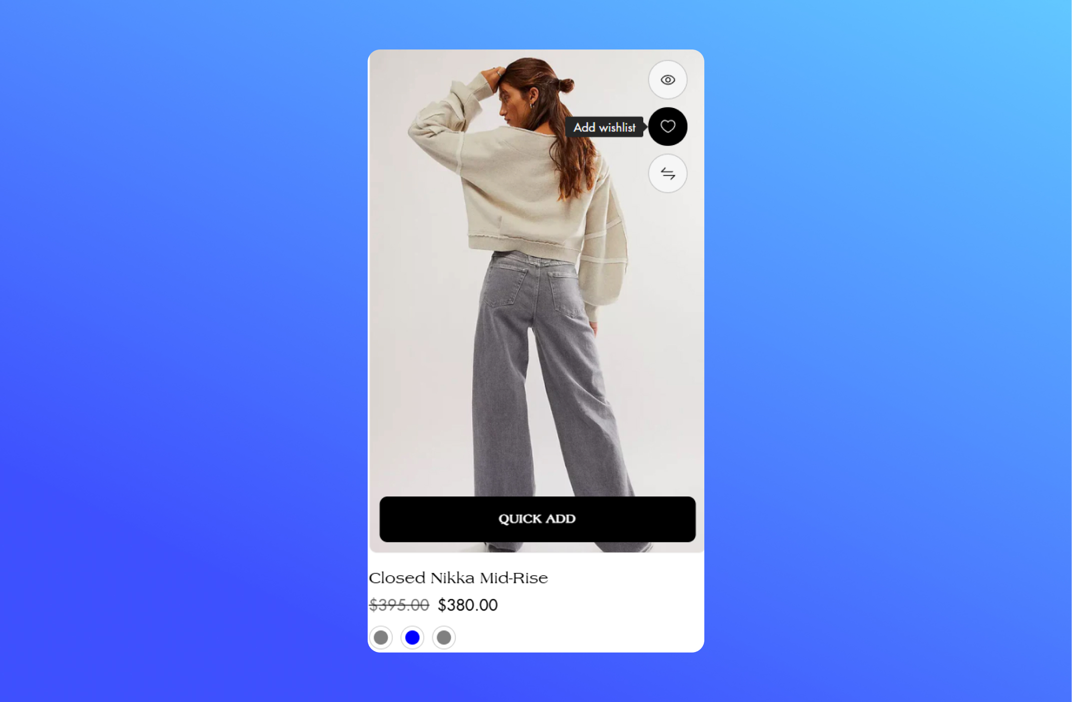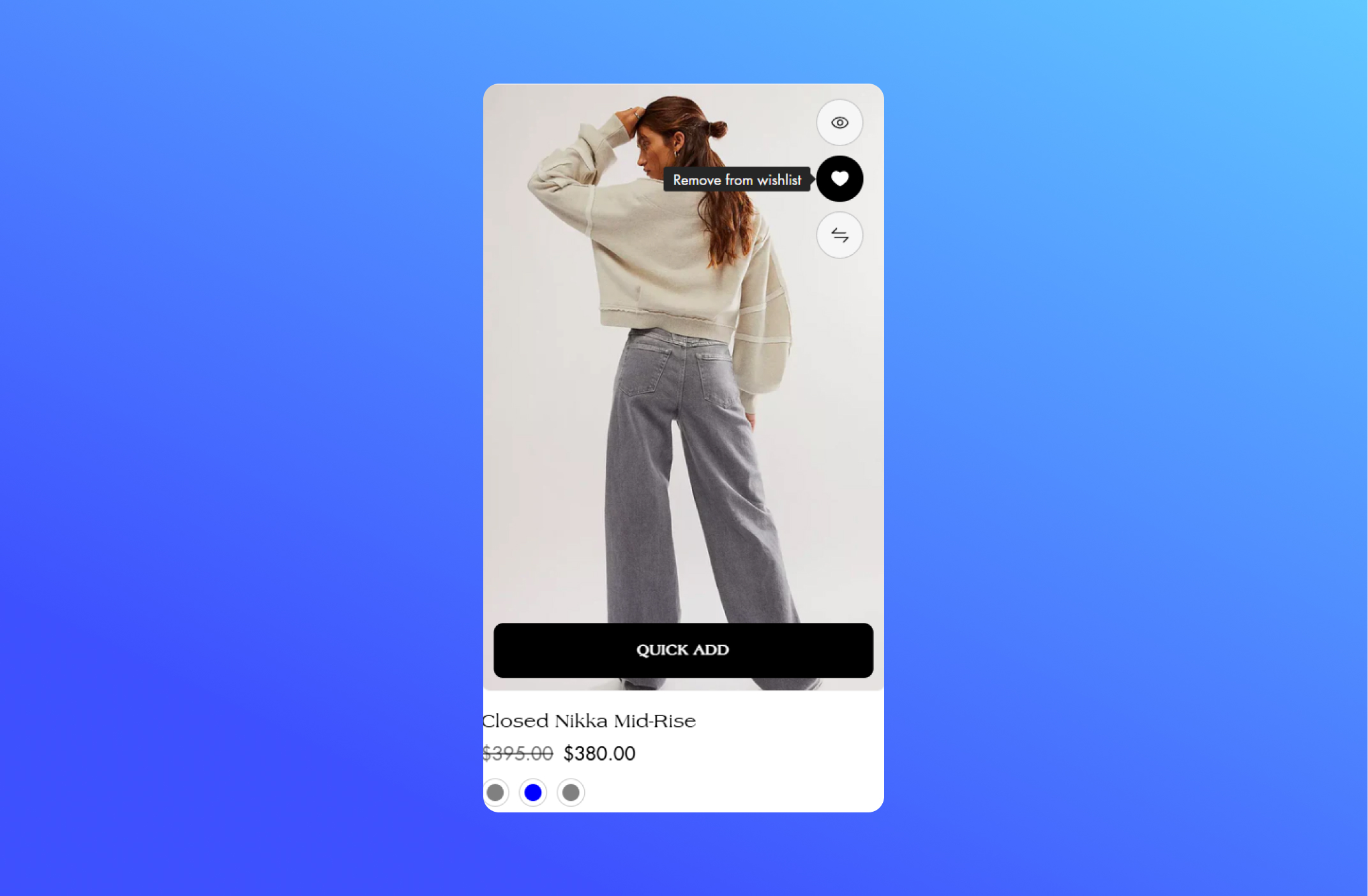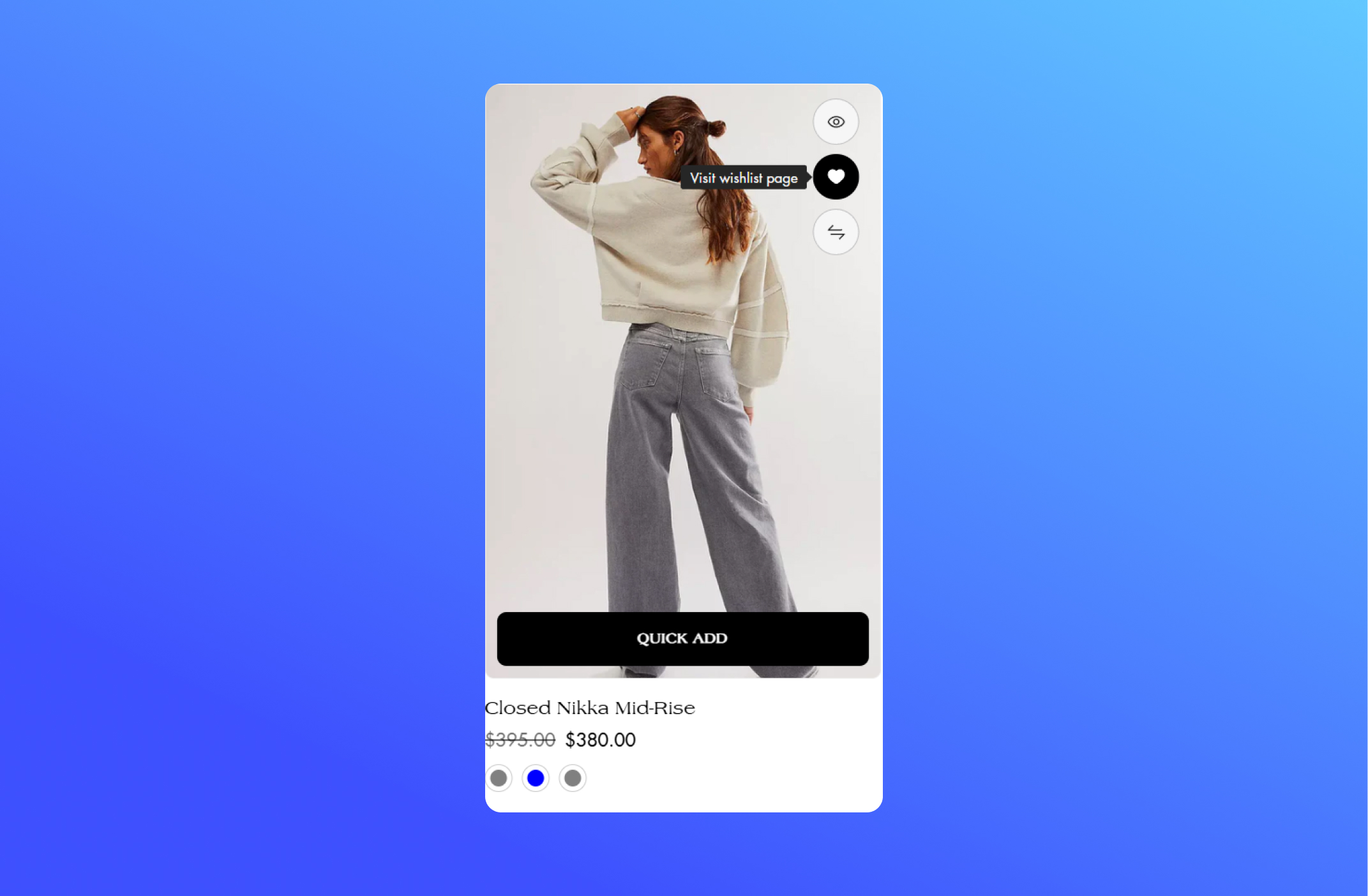 After adding the **"Wishlist"** section to your theme,  the **Wishlist** heart icon will appear on the product.  When you click on the **Wishlist icon**, the product will be automatically added to your favorites list on the **Wishlist** page.