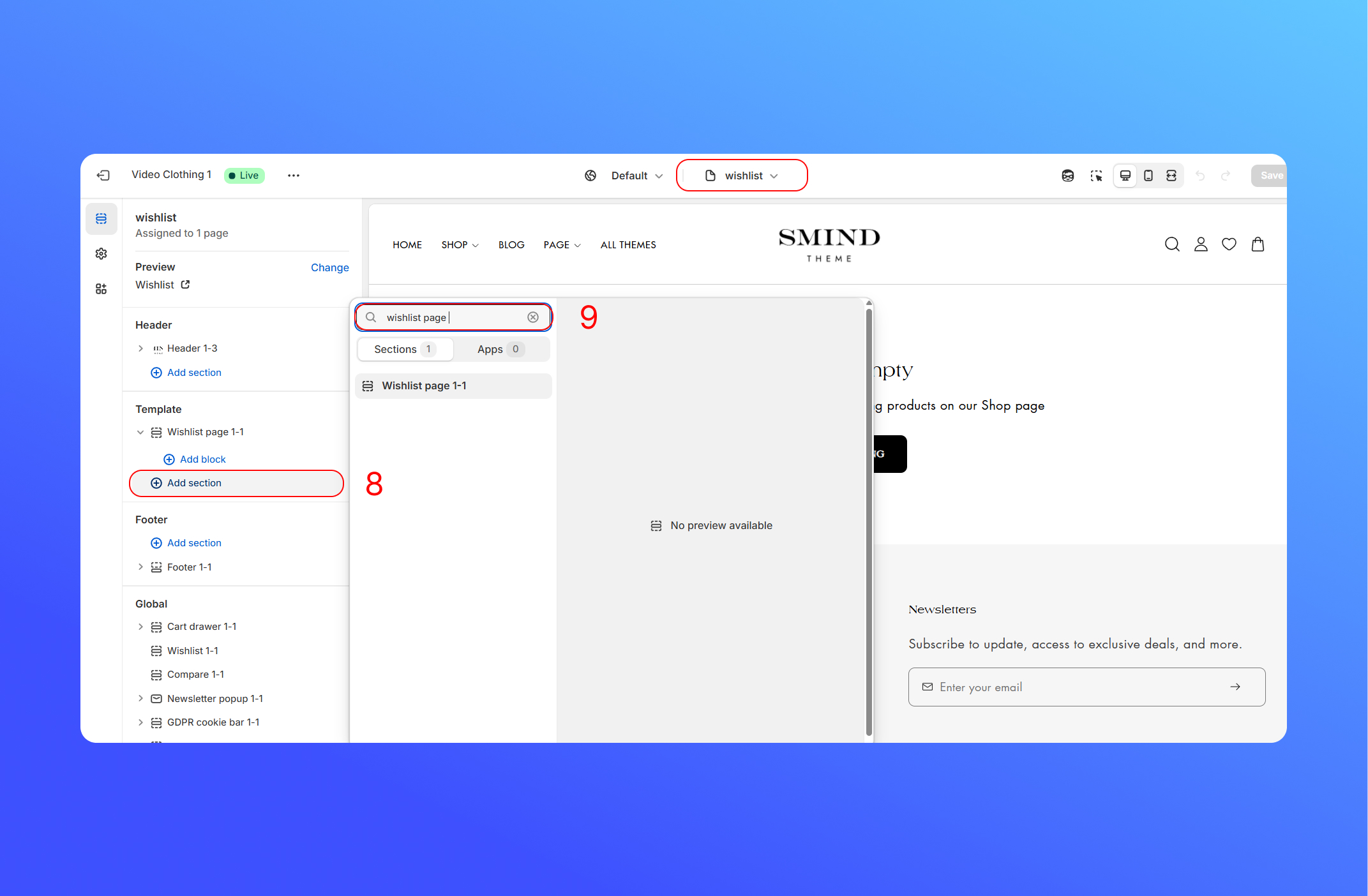 To use the **"Wishlist"** section, you also need to install the "**Wishlist Page"** section. Please follow the steps and images below."