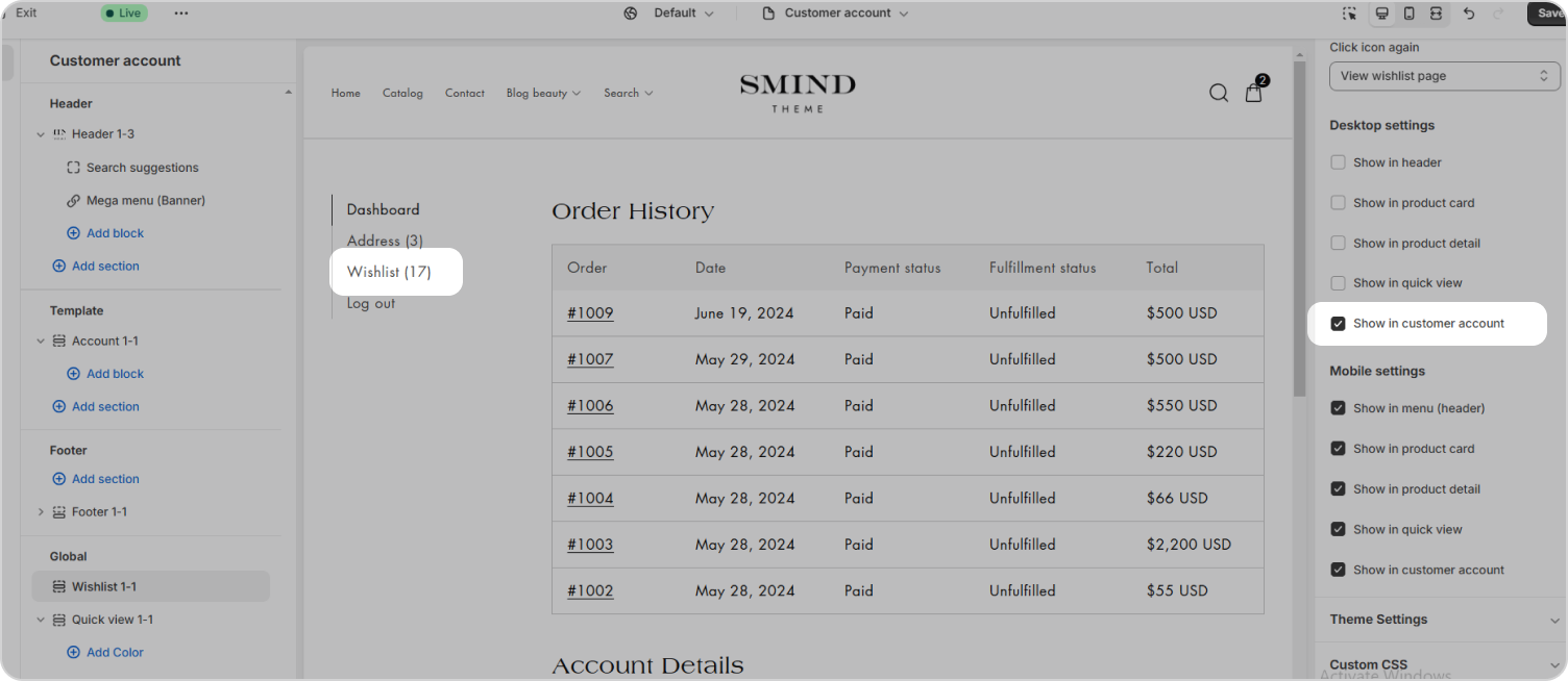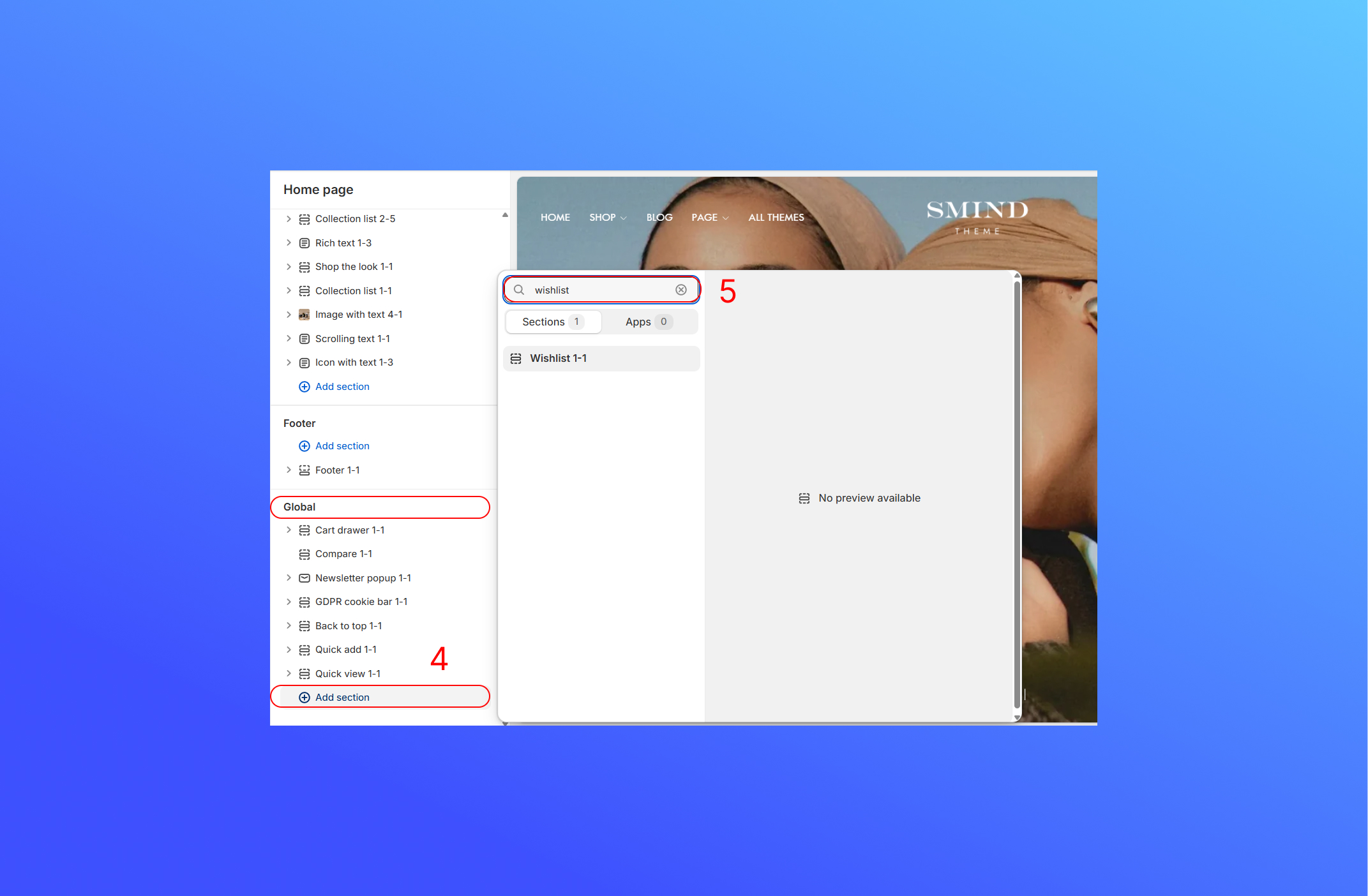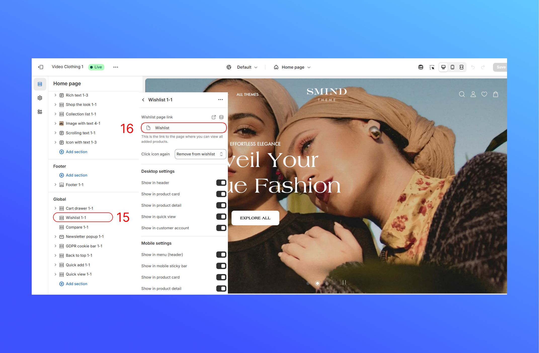 15. Go to Shopify Editor sidebar, click on **Wishlist** section under the Global section.